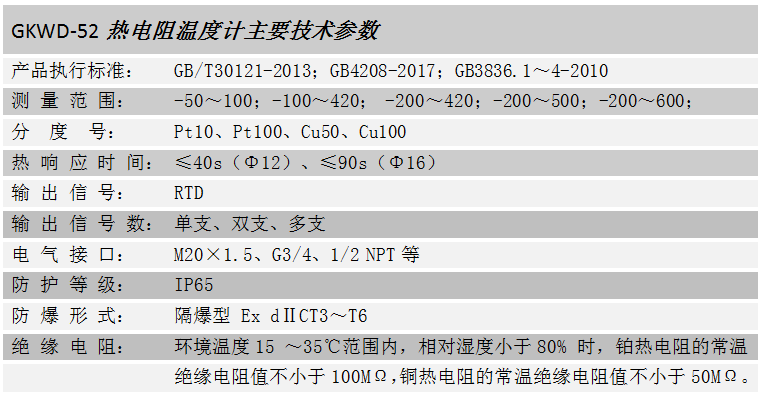 GKWD-52熱電阻溫度計(jì)是利用電阻與溫度呈一定函數(shù)關(guān)系的金屬導(dǎo)體或半導(dǎo)體材料制成的接觸式溫度儀表,可直接測(cè)量多種生產(chǎn)過(guò)程中從-200~600℃范圍內(nèi)的液體介質(zhì)、氣體介質(zhì)、蒸汽以及固體表面等的溫度,現(xiàn)已成為溫度遠(yuǎn)傳儀表的理想選擇。